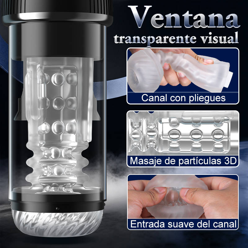 Ofrece una variedad de experiencias placenteras, incluyendo 5 modos de rotación, 5 modos de succión, 7 modos de vibración, sujeción neumática, estimulación con partículas 3D y un diseño de ventana transparente.